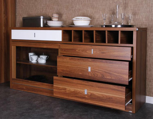 上圖是使用胡桃木紋裝飾防火板制作的柜子,可以看到整體的效果上都沒得說,木紋的仿真程度都很高,不過有一點就是無法裝飾防火板無法做到隨意彎折,所以制成的家具多為平直類型的;