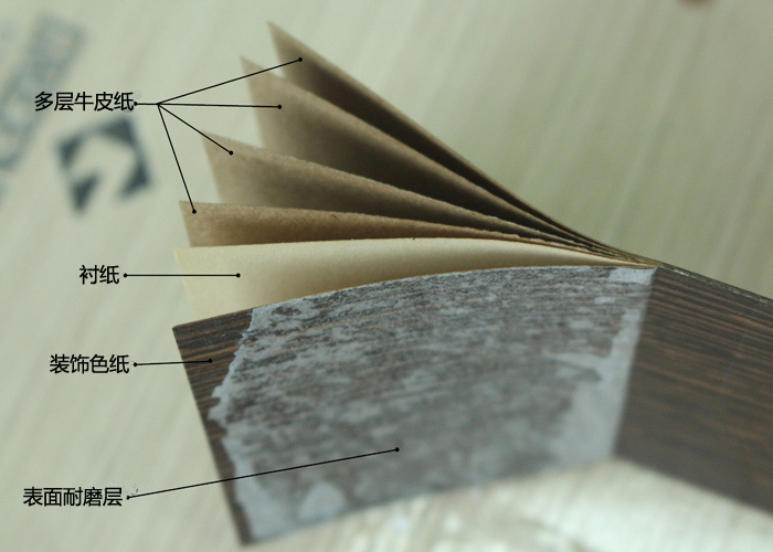裝飾防火板表面是有一層特殊材料的耐磨層,表面耐磨 ≥350轉 700轉這么一個參數可以參考,往里是色紙,可以自由選擇,根據裝修風格而定;之后就是牛皮紙,經過含浸三聚氰胺和酚醛樹脂等經過高溫高壓制成。