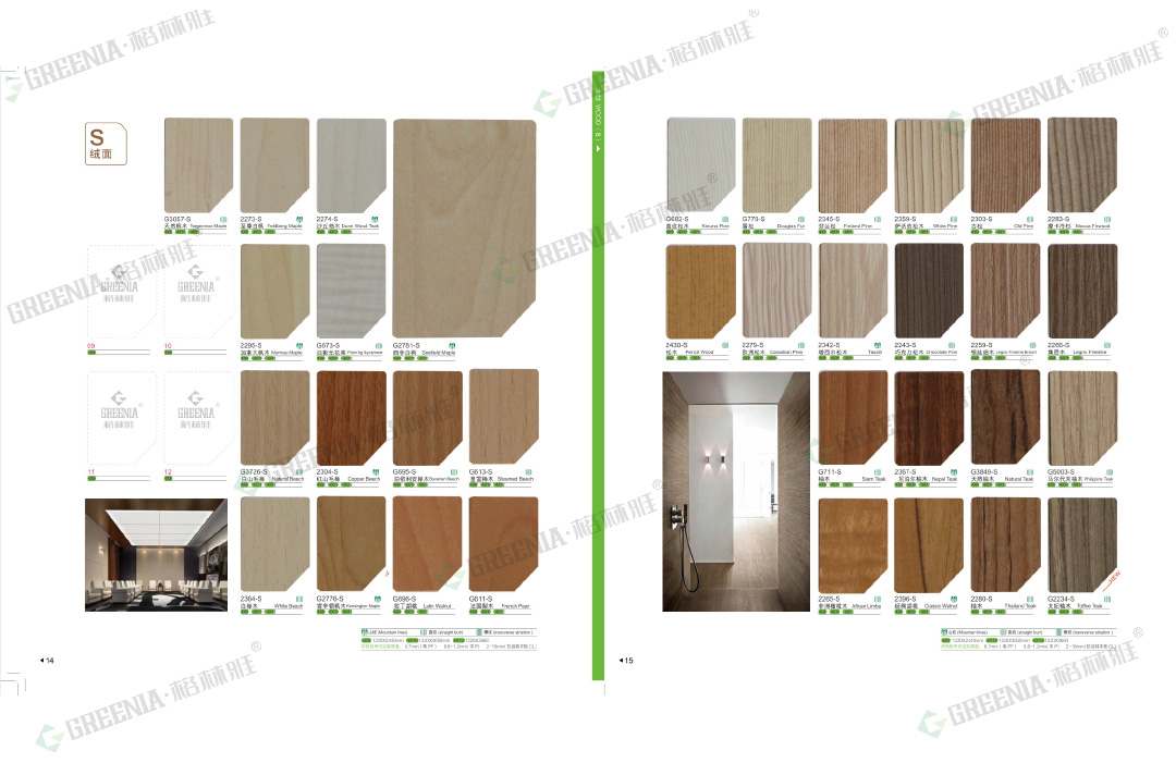 格林雅防火板擁有55種表面處理及3532種花色紋路,品種齊全。包括光面G、啞面M、絨面S、油漆P、霧面WS、波浪紋RS、壓木紋X、編織紋PX、優雅皮紋XO、皮紋SL、壓木紋SH、拉絲ST、刷木紋F、優雅刷木紋MF、絲絨面CF、羽翎面FT、纖絲紋、天然木皮、影點U、橫紋E、豎紋H、雨絲紋MV、橫紋WH、原木刷紋WB等多種不同的表面處理,可做成平板、彎曲板。歡迎您來樣定做!