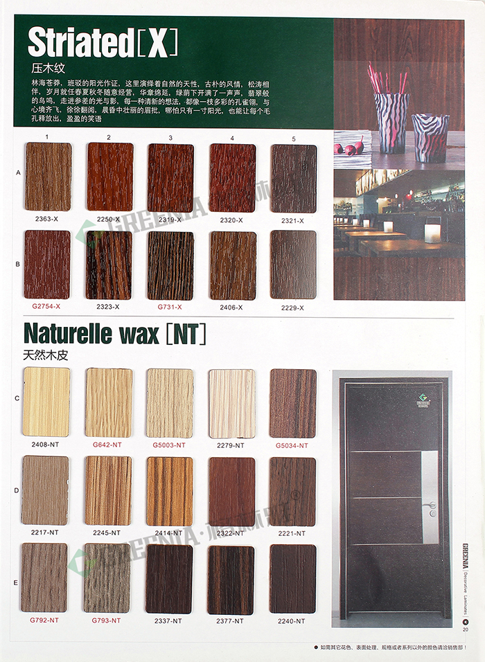 格林雅防火板擁有55種表面處理及3532種花色紋路,品種齊全。包括光面G、啞面M、絨面S、油漆P、霧面WS、波浪紋RS、壓木紋X、編織紋PX、優雅皮紋XO、皮紋SL、壓木紋SH、拉絲ST、刷木紋F、優雅刷木紋MF、絲絨面CF、羽翎面FT、纖絲紋、天然木皮、影點U、橫紋E、豎紋H、雨絲紋MV、橫紋WH、原木刷紋WB等多種不同的表面處理,可做成平板、彎曲板。歡迎您來樣定做!