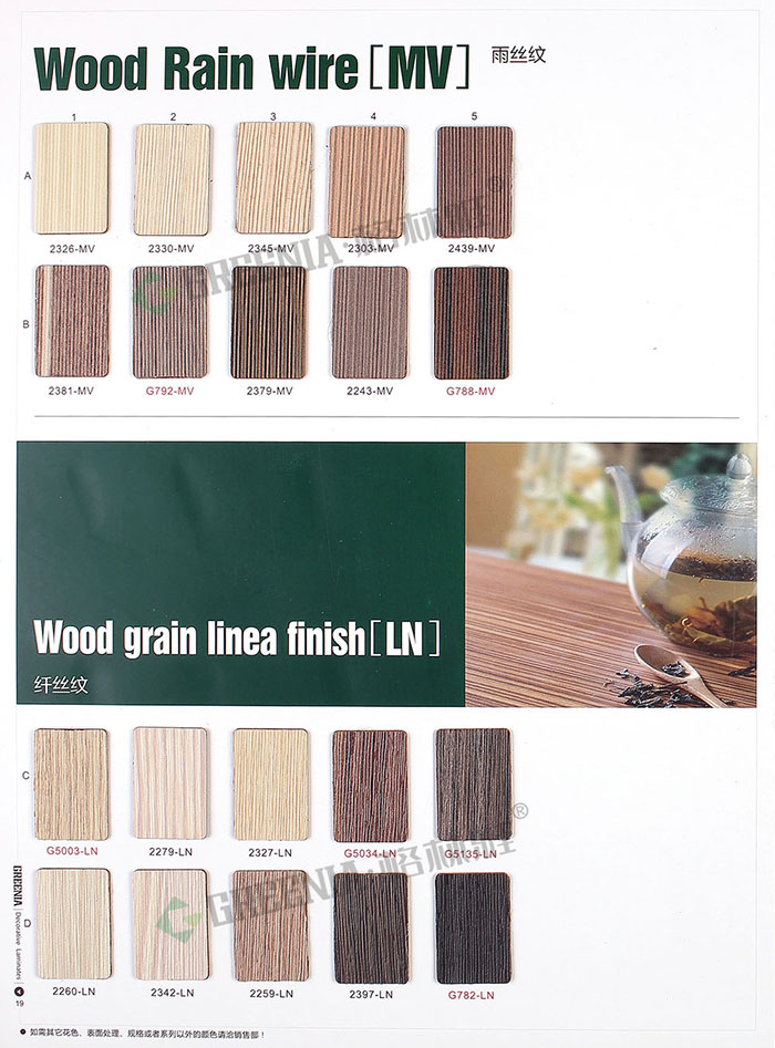 格林雅防火板擁有55種表面處理及3532種花色紋路,品種齊全。包括光面G、啞面M、絨面S、油漆P、霧面WS、波浪紋RS、壓木紋X、編織紋PX、優雅皮紋XO、皮紋SL、壓木紋SH、拉絲ST、刷木紋F、優雅刷木紋MF、絲絨面CF、羽翎面FT、纖絲紋、天然木皮、影點U、橫紋E、豎紋H、雨絲紋MV、橫紋WH、原木刷紋WB等多種不同的表面處理,可做成平板、彎曲板。歡迎您來樣定做!
